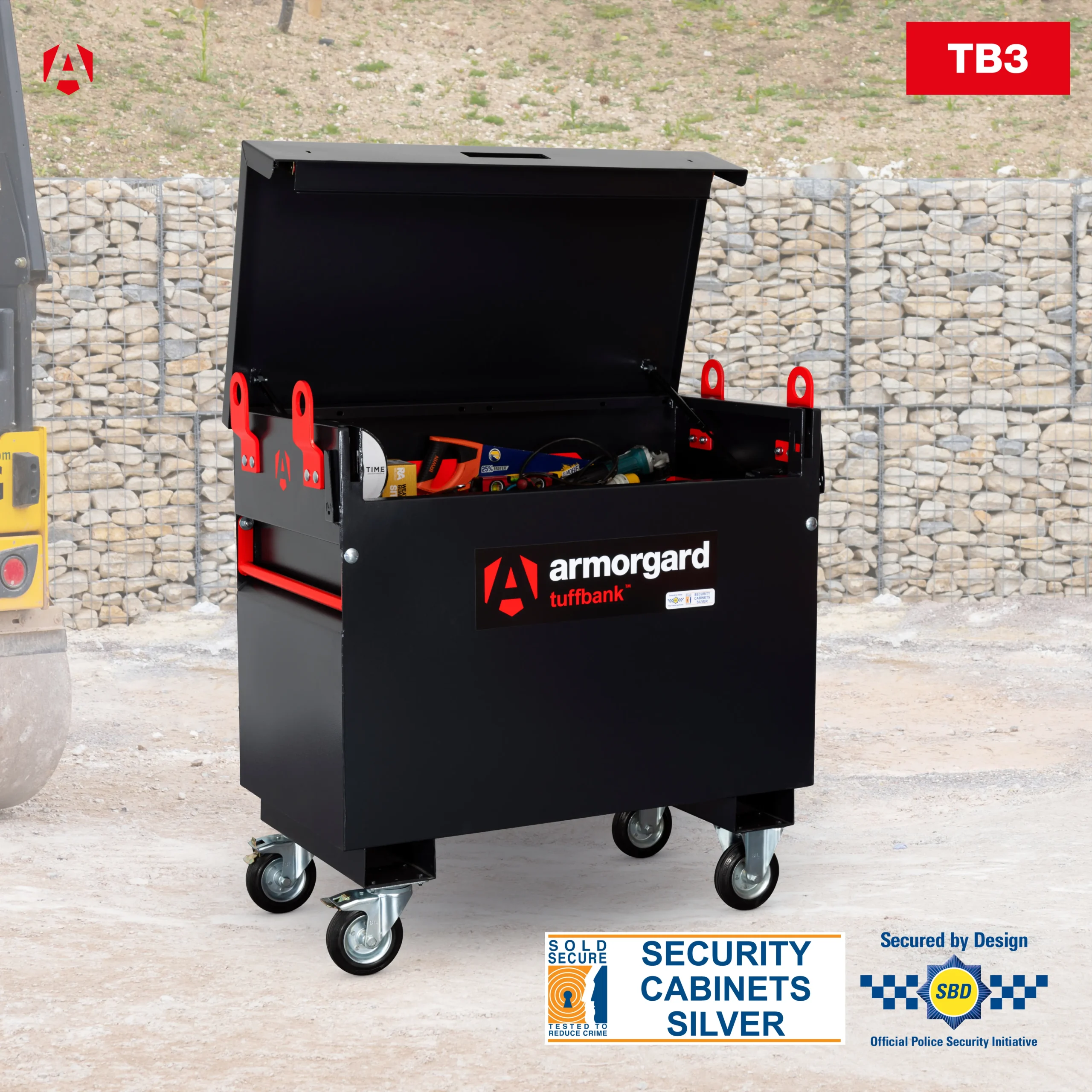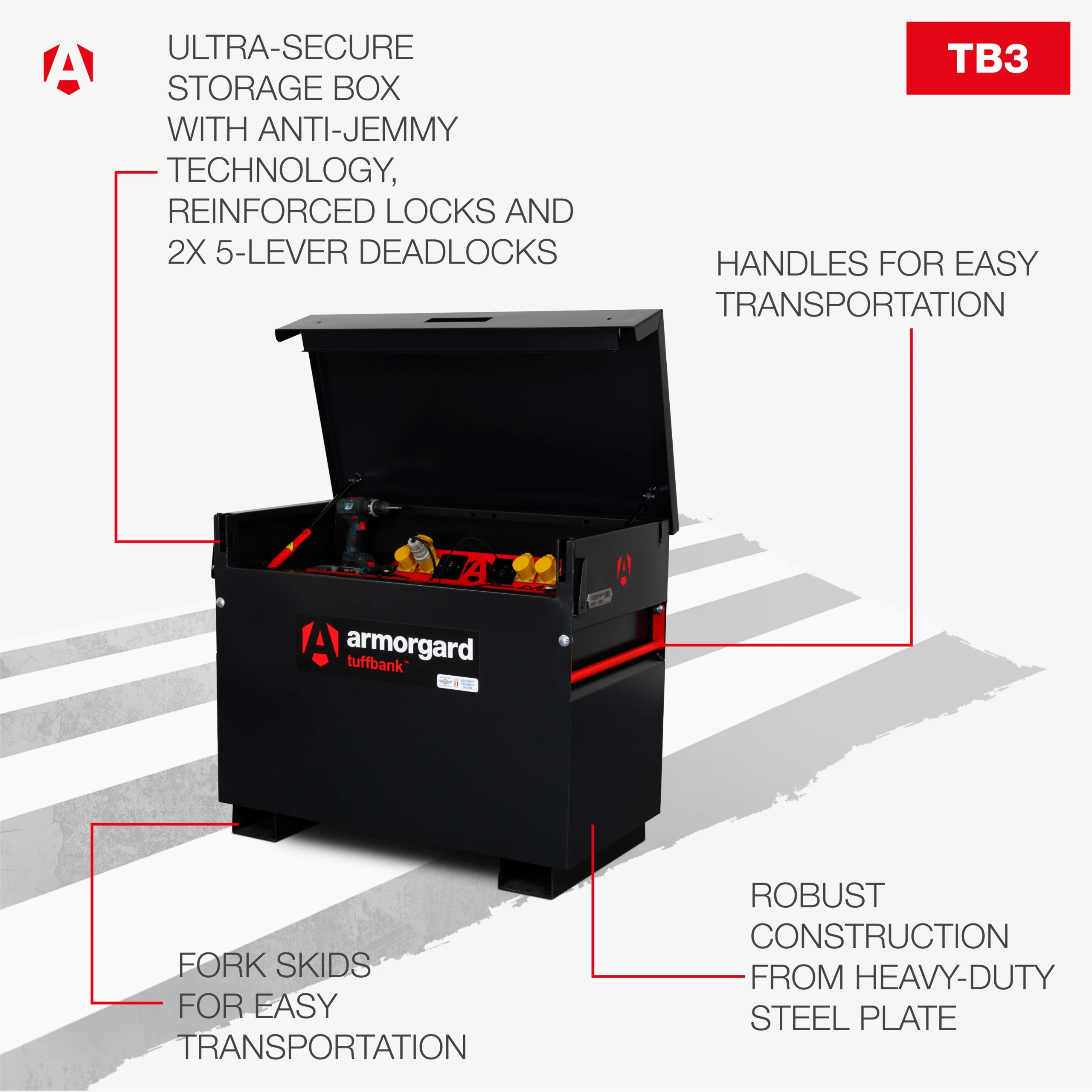 The new and improved TB3 is your ideal solution for secure, reliable storage on construction sites or other work environments. While one of the smaller site boxes in the TuffBank range, TB3 is still spacious enough to store tools and equipment for any job.