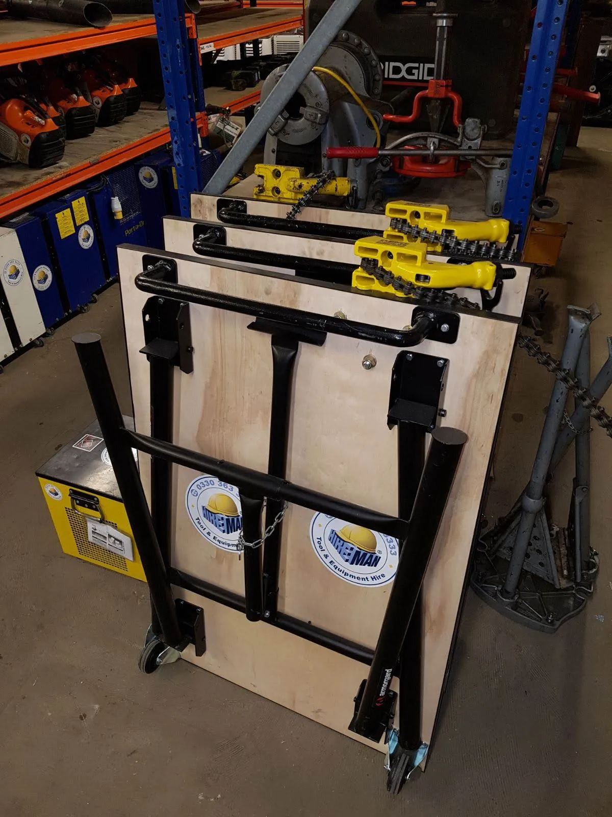 The folding legs are secured with a chain when shut.
